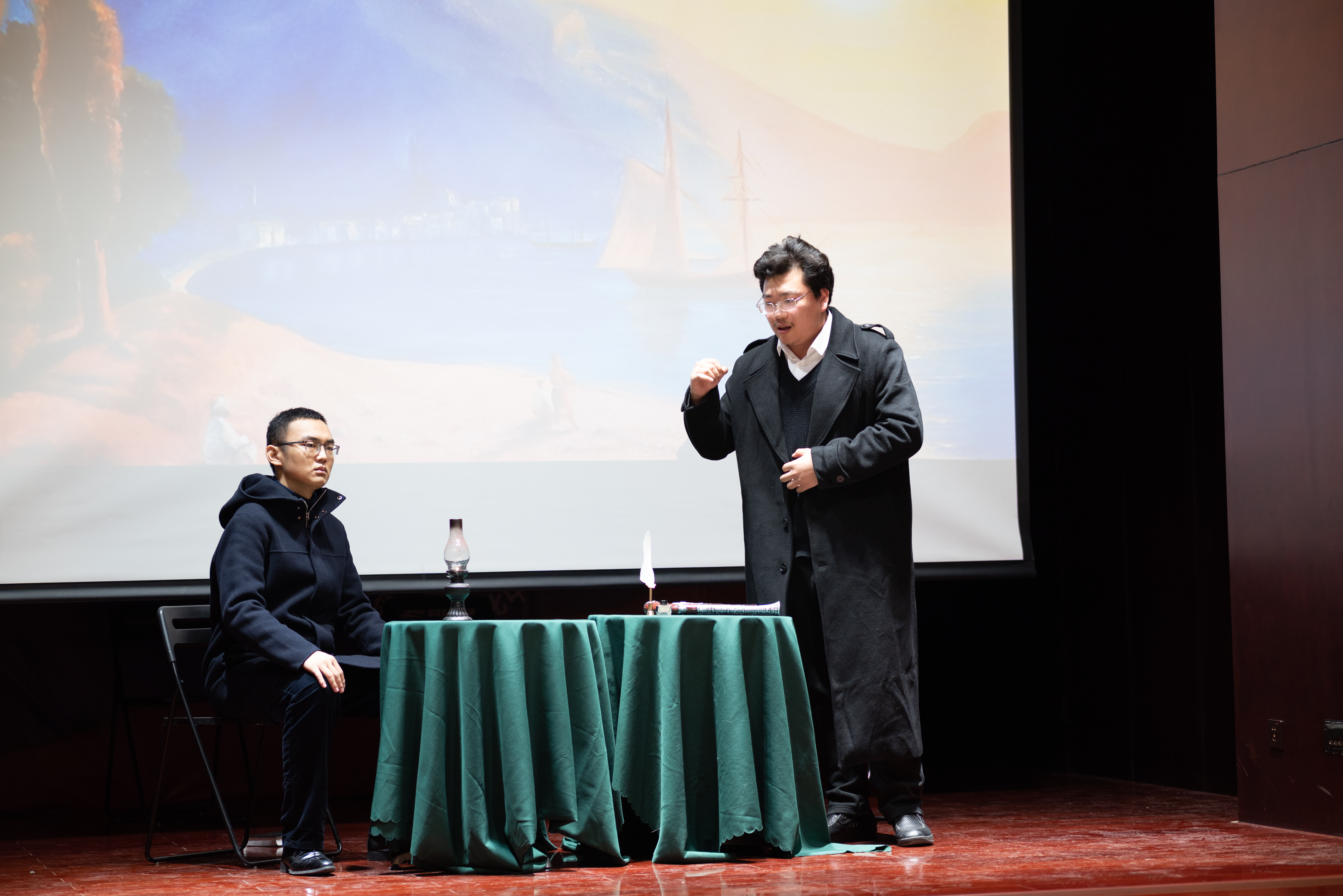 由新利·体育,新利(中国)官方俄罗斯语言文学系同学排演的三幕话剧«Раскольник и др.»(《拉斯柯尔尼科夫一众》)是本次活动的第五个节目。整部剧时长约十六分钟,《地下室手记》《罪与罚》《群魔》《荒唐人的梦》《卡拉马佐夫兄弟》中的主人公们轮番登场,他们在惶恐焦虑、急切不安的状态下爆发,以难以遏制的激情直抒胸臆。通过他们的表演,观众可以理解陀氏人物的内心世界,体会他们在思想上的传承、在观念上的碰撞。每幕仅五六分钟的话剧,布景道具要而不繁,汇聚传统手法和现代风尚,有力呈现了陀氏作品的精神内涵。