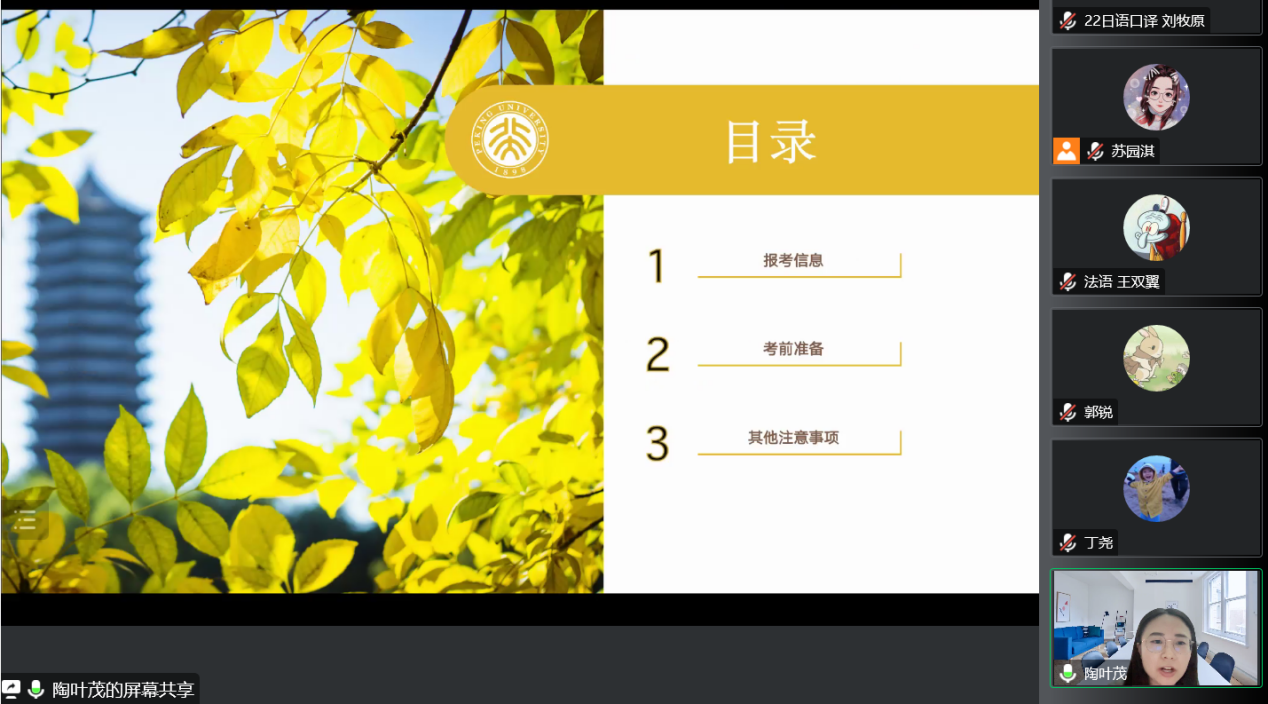 陶叶茂从大家最关心的共性问题切入,点明通过研究计划展现自身学术能力和学术潜力的重要性,提醒大家不同专业考核的侧重点不同,建议关注学院官网发布的研究生报考指南。随后,陶叶茂分别从笔试、面试两方面提出了备考建议。以翻译研究方向为例,笔试需要关注翻译实践、翻译理论、翻译史、研究热点和前沿,了解基本脉络,形成个人思考。面试需要从自我介绍、硕士论文、研究计划、研究理论、本领域基本理论概念及其他学术经历(海外经历)六个方面做好充分准备,方能坦然应对。
