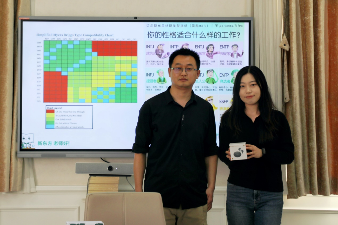 活动伊始,新东方国际HR武中豪向在场师生讲解了新东方的创立背景、经营理念、发展历程,并介绍了新东方的员工培训体系和职业发展路径,以及国际教育培训事业部的招聘职位、薪资待遇及面试流程等。