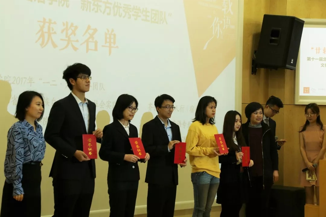 接下来进行的“新东方优秀学生团队”颁奖仪式中,10支获奖团队代表上台领奖,李淑静、高静、付志明、宋扬上台为获奖代表颁奖。之后,“新东方优秀学生团队”获奖团队代表、外国语学院2018级亚非语言文学硕士研究生许洋分享东南亚华文教育调研小组团队实践收获。