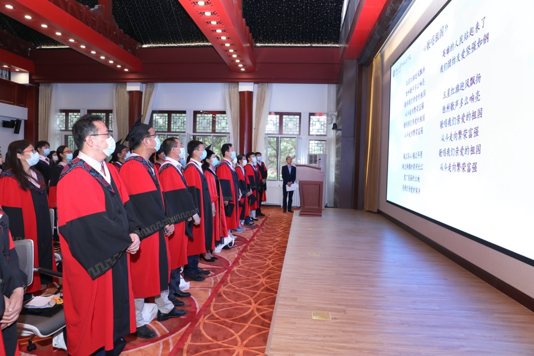 典礼临近结束,全场合唱《燕园情》和《歌唱祖国》,毕业生们将对外院、对北大的依恋之情凝注其中,表达了对北大校园的无限依恋,也唱出了胸中的凌云壮志,用青春告白外院、告白北大、告白祖国。