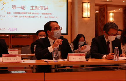 永旺(中国)投资有限公司财务会计总经理久久津智彦先生发表致辞。他指出,在新冠疫情影响下,我们的社会生活和日常生活都发生了变化。在人与人交流都受到约束的大环境下,同学们激情澎湃的演讲,让他对未来充满了希望。久久津智彦先生表示,中日两国一衣带水、文化同源,有两千多年的友好往来历史,希望选手们能够成为连接中日两国友好的桥梁,为中日乃至世界的发展做出贡献。