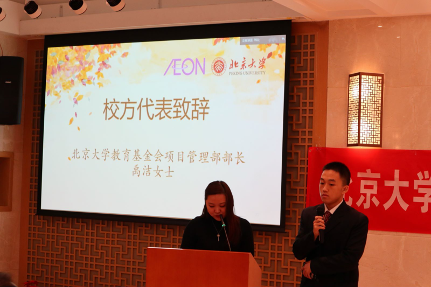 赛后,北京大学教育基金会项目管理部部长禹洁女士向本次活动的赞助单位公益财团法人永旺1%俱乐部、永旺香港百货有限公司、AEON信贷财务(亚洲)有限公司表达诚挚的感谢。她提到,多年来,外国语学院日语系的师生们致力于传播中日两国文化,增进两国人民之间的友谊。今年是北大“永旺杯”举办的第五个年头,作为项目的管理方和参与者,禹洁表示很高兴看到北大学子们在比赛中尽情展现风采。她希望同学们牢记北大人的精神与历史使命,在未来发挥自己的语言优势,为中日友好做出贡献。最后,她祝愿“永旺杯”日语演讲比赛越办越好,发挥中日交流中的桥梁纽带作用。