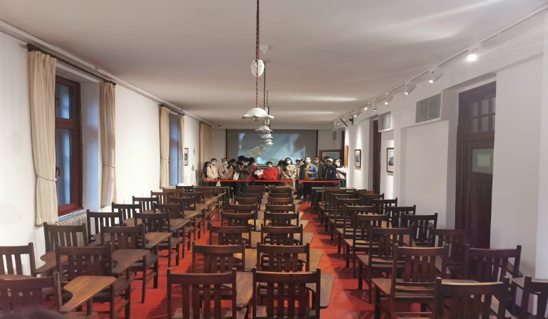 沿着走廊探索,同学们来到了第三十六教室。这间教室是红楼内面积最大的教室,李大钊在此为学生讲授马克思主义理论课程,鲁迅也曾在此讲授中国小说史。同学们看着全息影片,听着语音讲解,环顾着古朴的讲台和当时学生使用的木质桌椅,仿佛看到了当年教室里坐满求知若渴的进步学生的场景。