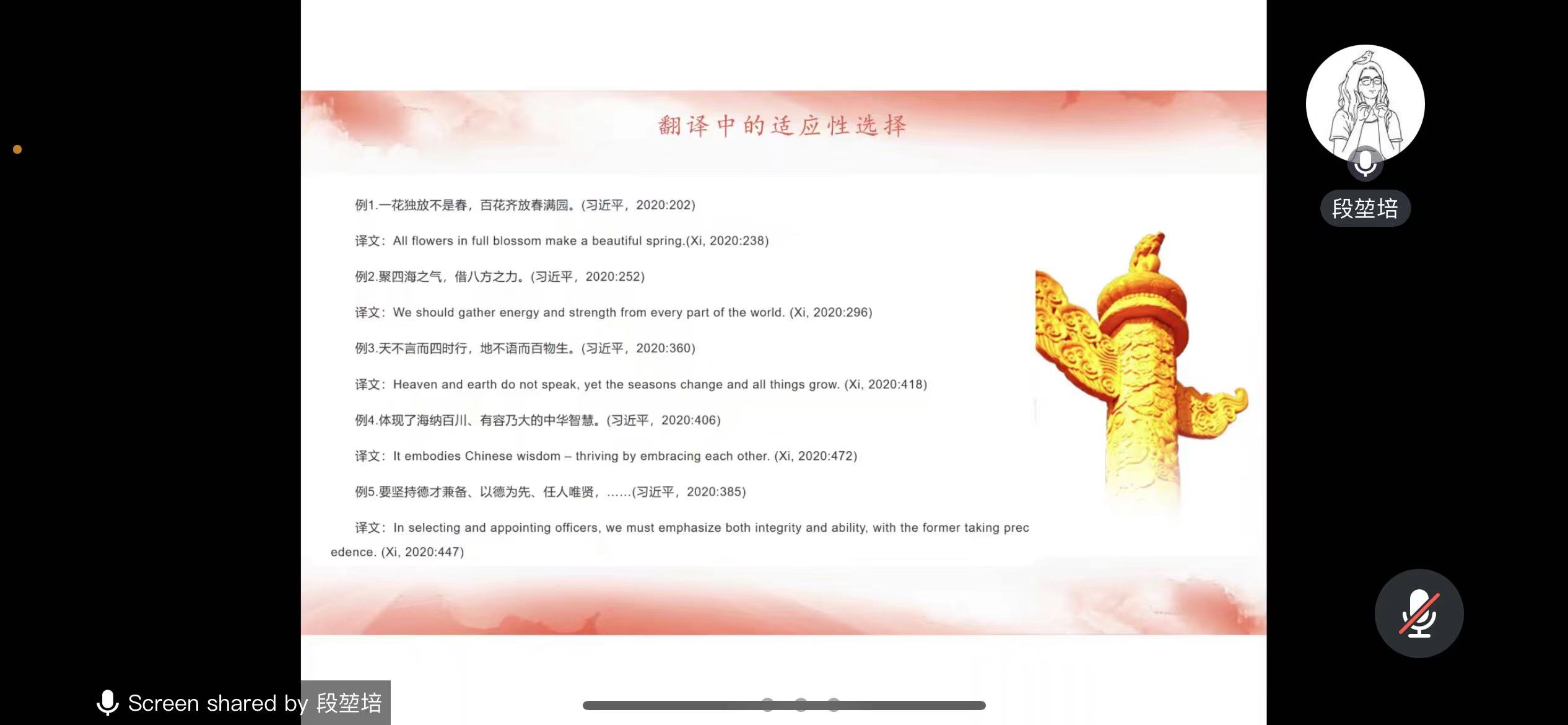 在6月3日的英语班读书会上,2021级博士生、领读者段堃培带领2022级英语本科生学习了《习近平谈治国理政》(第三卷)中的用典及功能,随后带领同学们赏析了《习近平谈治国理政》(第三卷)的翻译效果,并就《习近平谈治国理政》中的典故翻译进行了双语学习,帮助同学们认识到了成功翻译典故在传播和构建良好中国形象中的重要性。