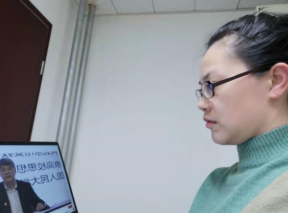 (学院党委委员、支部党员王丹老师带领学生观看直播课)