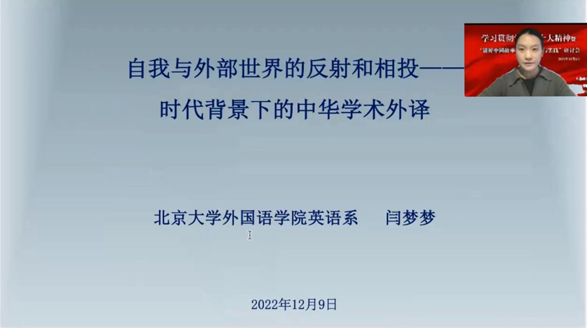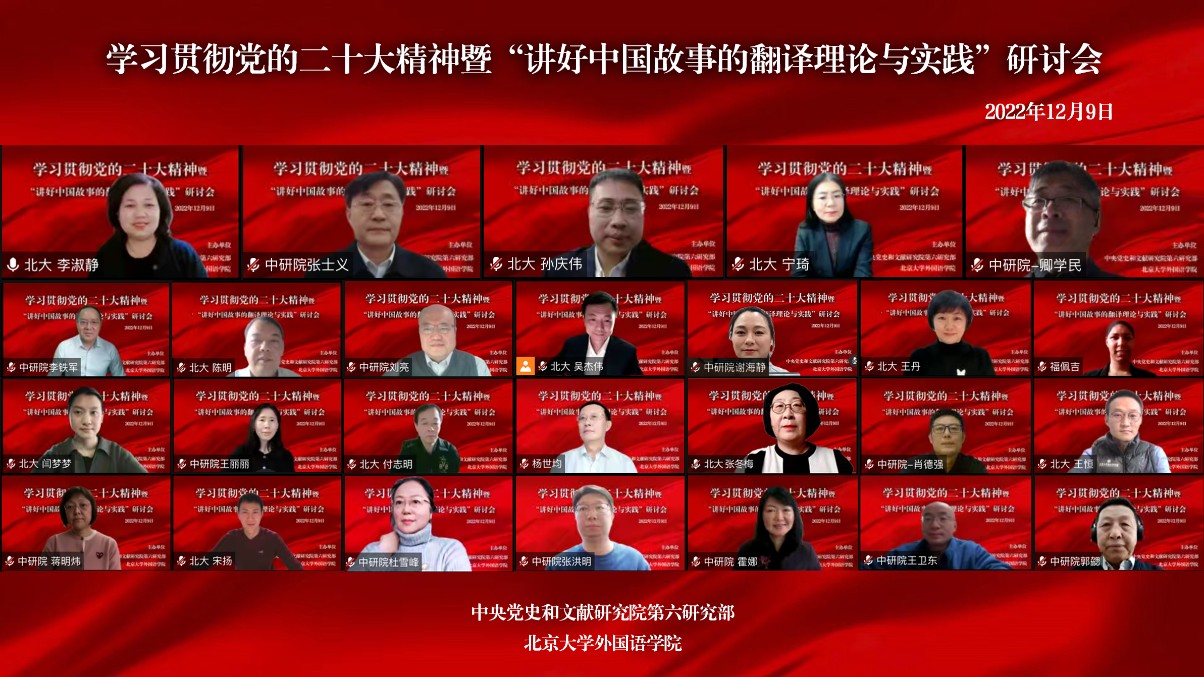 为深入学习贯彻党的二十大精神,加强国际传播能力建设和高端翻译人才培养,中央党史和文献研究院第六研究部与新利·体育,新利(中国)官方联合举办了学习贯彻党的二十大精神暨“讲好中国故事的翻译理论与实践”研讨会。会议于12月9日下午在线上举行。中央党史和文献研究院第六研究部主任张士义,北京大学党委常委、副校长孙庆伟,北京大学党委副书记、副校长宁琦,新利·体育,新利(中国)官方院长陈明等出席会议。新利·体育,新利(中国)官方党委书记李淑静主持开幕式。中央党史和文献研究院第六研究部全体在职人员和外国专家、新利·体育,新利(中国)官方师生共160余人相聚云端。