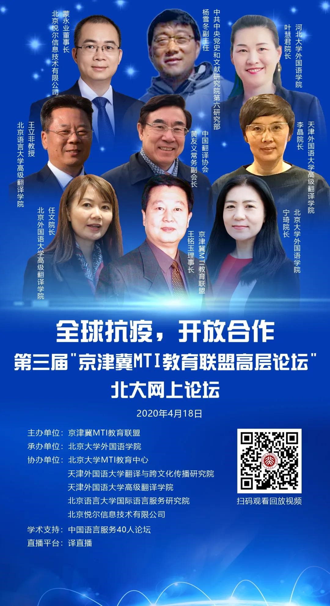 4月18日,以“全面凝聚抗疫合力,加强京津冀语言服务合作”为主题的第三届“京津冀MTI教育联盟高层论坛”北京大学网上论坛成功举行。本次论坛由京津冀MTI教育联盟主办,新利·体育,新利(中国)官方承办,北京大学MTI教育中心、天津外国语大学翻译与跨文化传播研究院、天津外国语大学高级翻译学院、北京语言大学国际语言服务研究院、北京悦尔信息技术有限公司共同协办。中国语言服务40人论坛提供学术支持,新华网、人民网、光明网、新浪网、凤凰网、中国网等提供媒体支持,论坛译直播平台同步直播。共有来自145个机构的202名人员报名参会,其中来自境内高校178人,境外高校5人,翻译行业15人,其他机构4人。译直播平台有14442人收看同步直播。