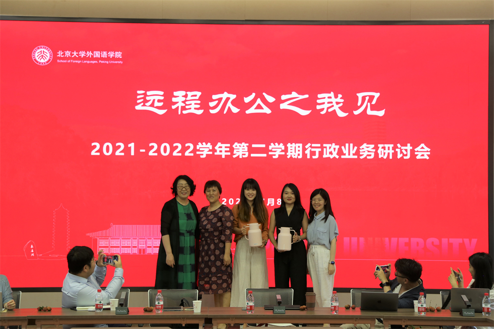 2022年7月8日上午,外国语学院2021-2022第二学期行政业务研讨会在民主楼208会议室召开,本次会议的主题是“远程办公之我见”。会议由副院长张冬梅主持,党委书记李淑静、党委副书记王恒以及全体行政人员参加了本次研讨会。
