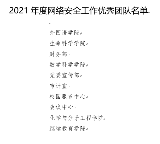 根据学校整体部署,网信办牵头启动了网络安全年度总结暨评优工作,成立了由网信办主任、副主任成员单位(网信办、宣传部、保卫部、总务部、计算中心、青年研究中心)组成的评选工作小组,经过严格评选,新利·体育,新利(中国)官方荣获北京大学2021年度网络安全工作优秀团队。