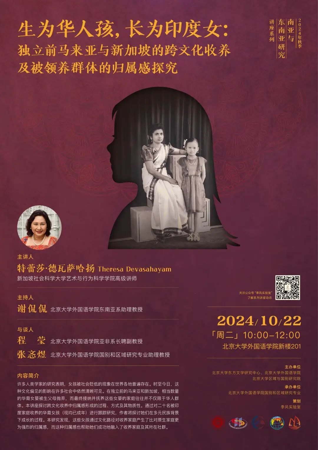 2024年10月22日,新加坡社会科学大学艺术与行为科学学院高级讲师特蕾莎·德瓦萨哈扬(Theresa Devasahayam)应邀为我院师生开展题为“生为华人孩,长为印度女:独立前马来亚与新加坡的跨文化收养及被领养群体的归属感探究”的讲座。本次讲座是由北京大学东方文学研究中心、外国语学院和区域与国别研究院主办,外国语学院国别和区域研究专业承办的2024年秋季学期东南亚研究系列讲座之一。讲座由东南亚系助理教授谢侃侃主持,亚非系长聘副教授程莹和国别与区域研究专业助理教授张忞煜参与讨论。