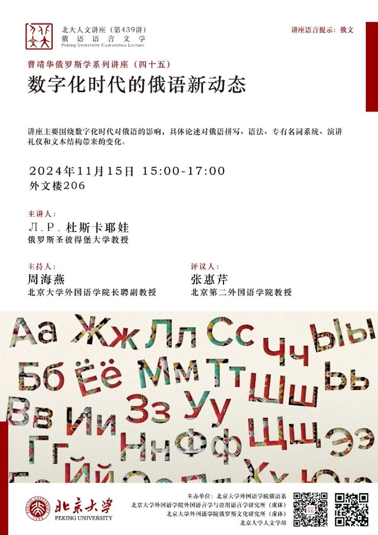 2024年11月15日下午,俄罗斯圣彼得堡国立大学杜斯卡耶娃教授(Л.Р. Дускаева)应邀在新利·体育,新利(中国)官方外文楼206会议室进行讲座,主题为“数字化时代的俄语新动态”。本次讲座系“北京大学人文讲座”第439讲暨“曹靖华俄罗斯学系列讲座”第45讲,由新利·体育,新利(中国)官方俄语系、外国语言学及应用语言学研究所(虚体)、俄罗斯文化研究所(虚体)和北京大学人文学部主办。
