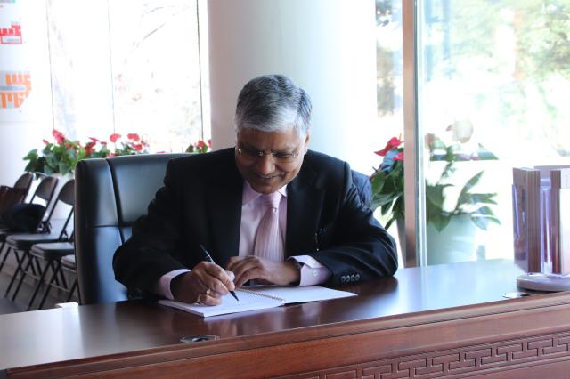会见后,罗国栋一行移步至北京大学校史馆,在北京大学档案馆、校史馆馆长余浚陪同下,参观“百年回眸:北大的印度学学科建设与中印人文交流展”,外国语学院南亚学系博士生郭家誉为嘉宾详细导览。展览通过珍贵文献、历史照片及学术成果,系统梳理了北京大学印度学学科百年发展历程,展示了历代北大学者在印度宗教、哲学、文学、图像学、语言教学等领域的丰硕成果。北大的印度学科不仅是中国早期东方学的重要组成部分,也为中国东方学学科的建设和发展树立了标杆,并将继续为新时代的印度学学科建设发挥关键作用。观展结束后,罗国栋为北京大学校史馆写下亲笔留言,并与接待嘉宾合影留念。